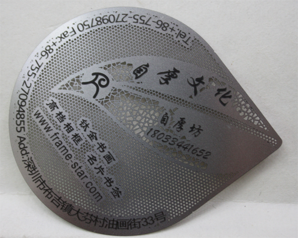 金属名片是透雕表现方式,以及具有丰富内涵的东方艺术语 言,在造型的疏密虚实、方圆顿挫、粗细长短的交织、变奏中,表现精巧入微、玲珑剔透的艺术效果!